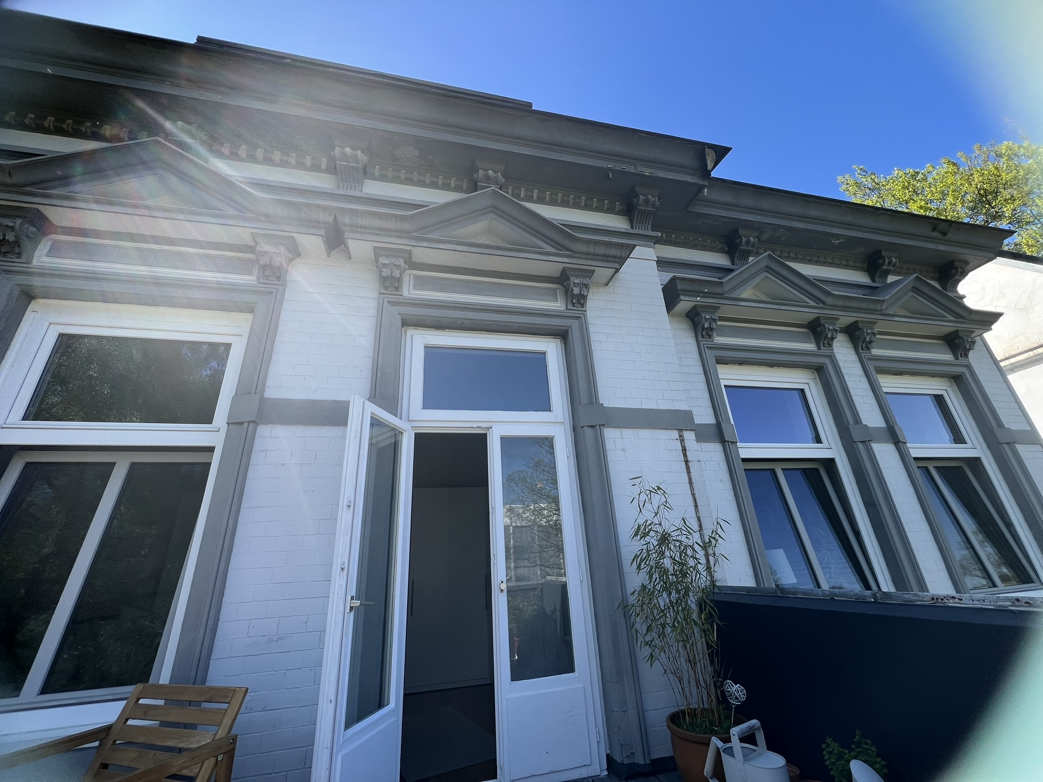 Originale Stilelemente – kunstvoll verzierte Fassadenteile, Stuckaturen, hohe Fenster. Viele Stil-Elemente innen wie außen sind erhalten.